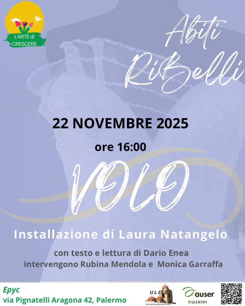 L’associazione L’Arte di Crescere, in collaborazione con ULITE Auser Palermo, presenta VOLO, una performance artistica che si terrà sabato 22 novembre alle ore 16:00 presso lo spazio culturale EPYC a Palermo. L’evento nasce nell’ambito del progetto Abiti RiBelli, iniziativa che trasforma abiti da sposa in arte, solidarietà e sport, con l’obiettivo di realizzare la prima area fitness pubblica e gratuita nel quartiere Sperone.