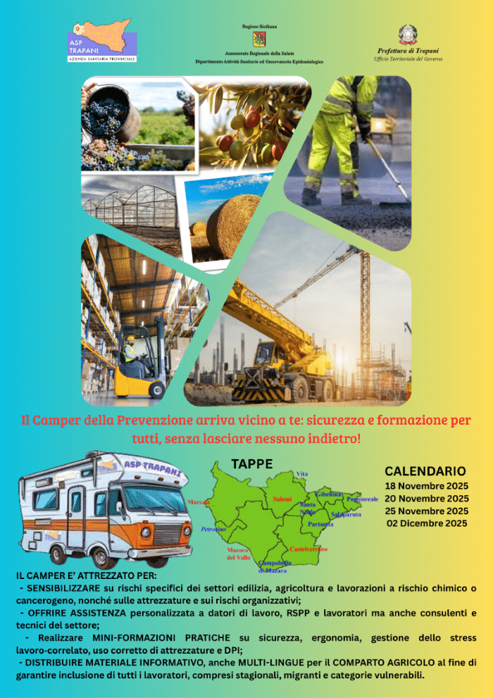 Informare, formare e assistere datori di lavoro e lavoratori per ridurre le diseguaglianze nell’accesso alla prevenzione e alla sicurezza sul lavoro. È l’obiettivo che il dipartimento di prevenzione dell’Asp Trapani intende perseguire attraverso l’iniziativa “Camper per la promozione della sicurezza nei luoghi di lavoro” in programma per quattro giornate, da martedì 18 novembre a giovedì 4 dicembre.