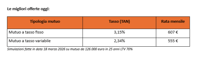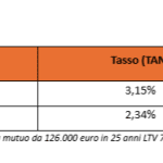 L’aumento della richiesta dei mutui variabili segnalato sopra è legato all’andamento dei tassi; secondo le simulazioni di Facile.it, per un finanziamento da 126.000 euro in 25 anni, il miglior tasso variabile (TAN) disponibile online è 2,34% con una rata iniziale pari a 555 euro. I migliori tassi fissi, invece, partono da un tasso (TAN) del 3,15% ed una rata di 607 euro, vale a dire circa 50 euro più alta rispetto a quella variabile.